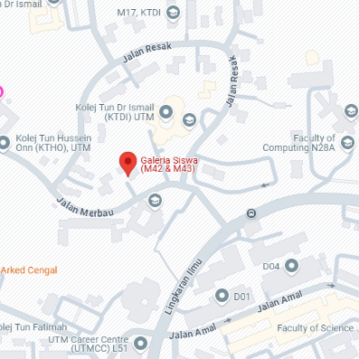 Our Location Bahagian Aktiviti dan Pembangunan Pelajar (BAPP), Galeria Siswa, Bangunan M42 & M43, Jabatan Timbalan Naib Canselor (Hal Ehwal Pelajar & Alumni), Universiti Teknologi Malaysia, 81310 Johor Bahru, Johor FollowFollowFollow Click Here