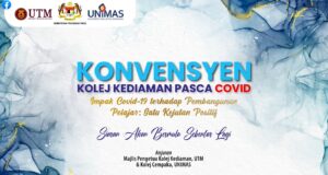 Konvensyen Kolej Kediaman Pasca COVID 2022 May 11, 2022 Konvensyen Kolej Kediaman Pasca COVID 2022 “Impak COVID-19 terhadap Pembangunan Pelajar: Satu Kejutan Positif” 11 Mei 2022 | Anjuran Majlis Pengetua Kolej Kediaman, UTM & Kolej Cempaka, UNIMAS