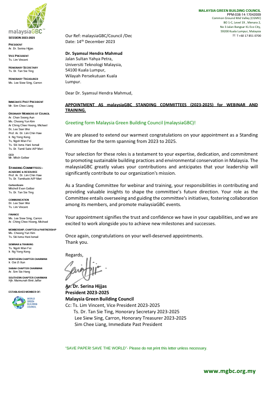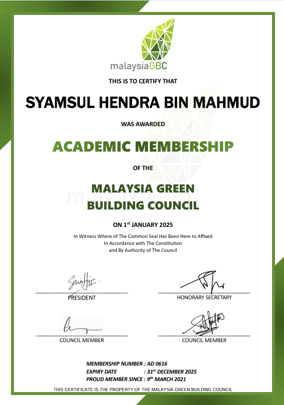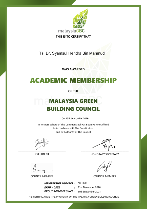 SUMBANGAN PTJ/INDIVIDU TERHADAP IMPAK KELESTARIAN DI DALAM KERAJAAN TEMPATAN Ts. Dr. Syamsul Hendra Bin Mahmud Membership Certificate Renewal – Syamsul Hendra Bin Mahmud MGBC Standing Committee – Syamsul Hendra Bin Mahmud Certificate MGBC 2026 – Syamsul Hendra Bin Mahmud