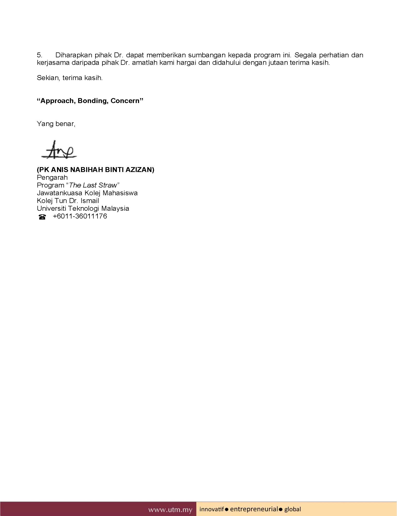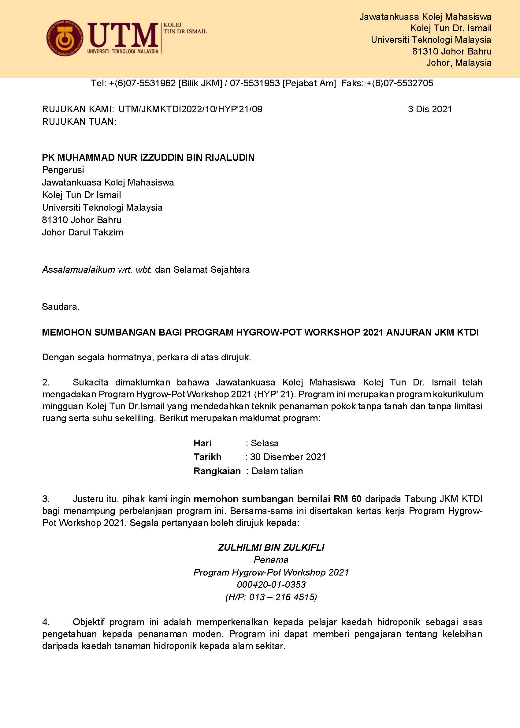 LIVING LAB – INSENTIF Surat Permohonan Dana Sumbangan – THE LAST STRAW Surat Permohonan Dana Sumbangan – HYGROW-POT WORKSHOP (HYP’21)