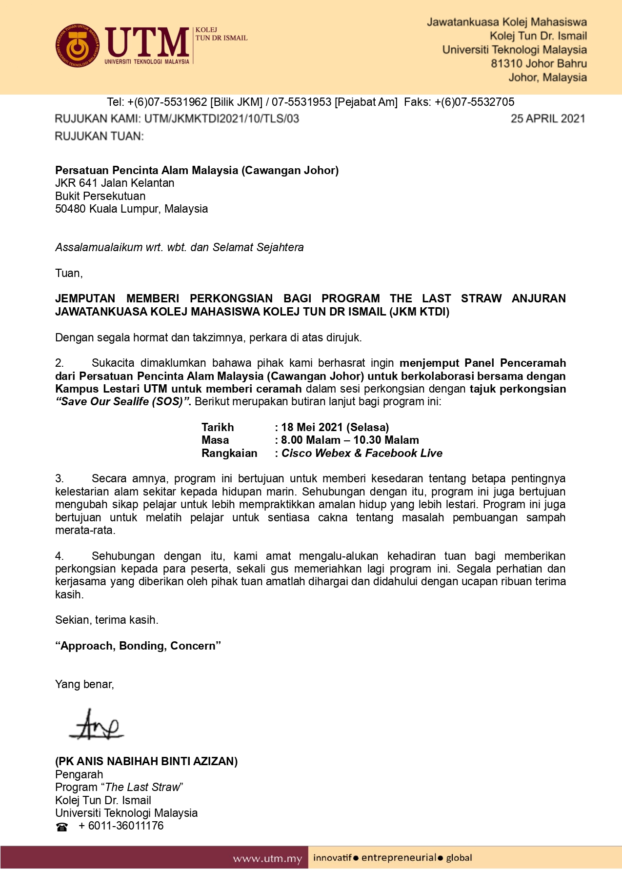 PROGRAM BERSINERGI DENGAN PTJ LAIN Tajuk Program THE LAST STRAW Senarai PTJ yang Bersinergi UTM CAMPUS SUTAINABILITY KUALA LUMPUR MALAYSIAN NATURE SOCIETY JOHORE (MNSJ) ML STUDIOS SDN. BHD. Surat jemputan kepadaa PTJ yang Bersinergi