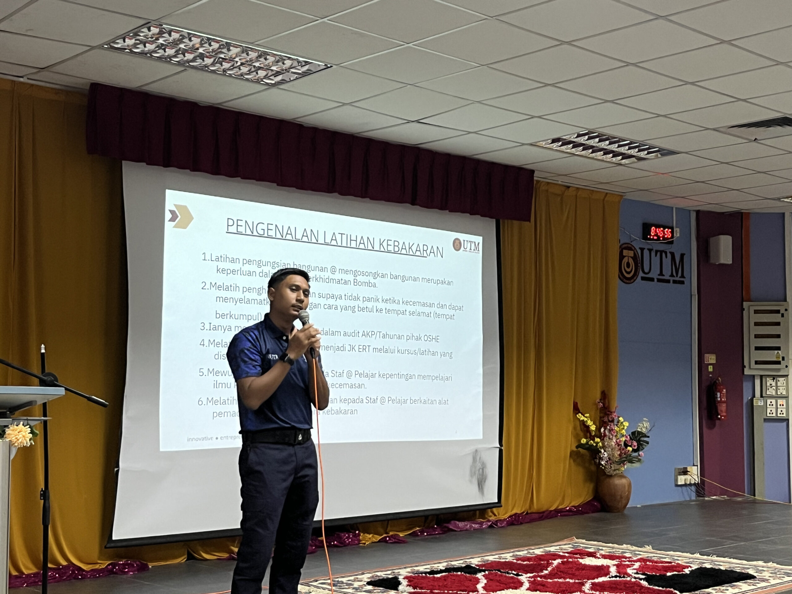 Dalam sesi ini, peserta diberikan penerangan mengenai prosedur pengungsian yang betul, termasuk laluan keluar kecemasan, titik berkumpul (assembly point), serta peranan setiap individu semasa situasi kebakaran. Selain itu, peserta turut diingatkan agar tidak panik, sentiasa bertenang, dan mematuhi arahan yang diberikan bagi mengelakkan sebarang kecederaan atau kekeliruan semasa proses pengungsian dijalankan.