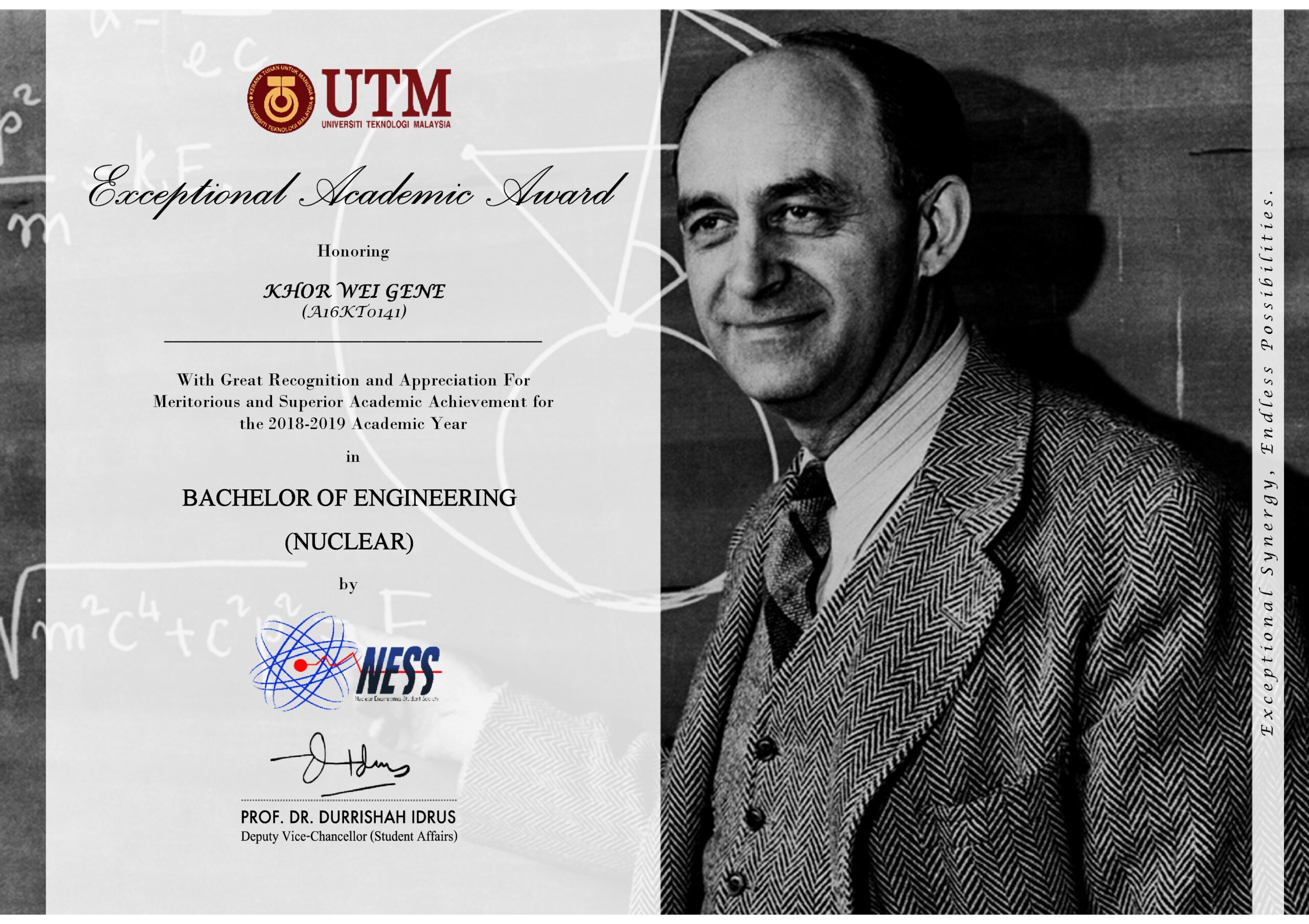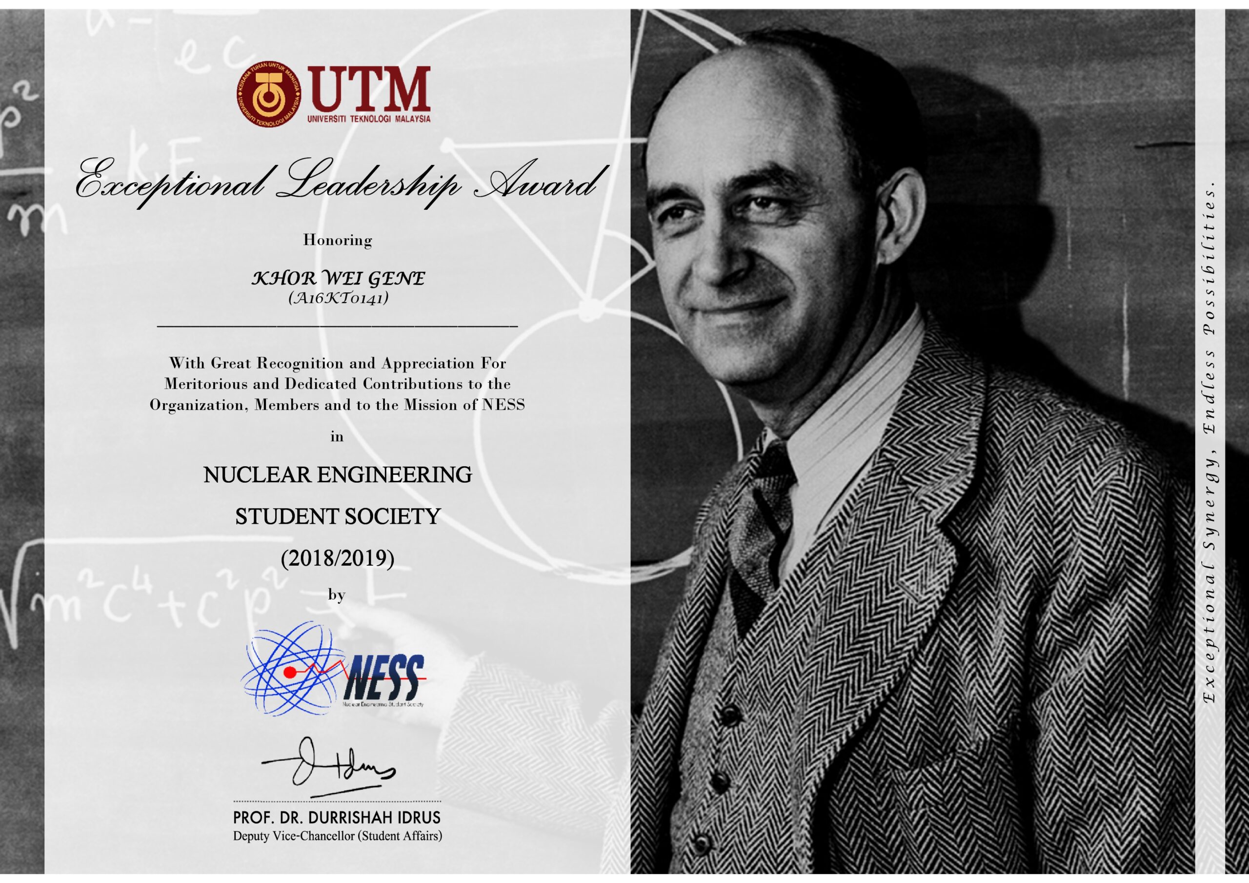 It is my greatest honour and privilege to serve the Nuclear Engineering Student Society (NESS) of Universiti Teknologi Malaysia (UTM) as the 2018/19 president. On behalf of the 2018/19 council leaders of NESS, I would like to express our unfeigned gratitude to all the past councils and board of trustees for their stewardships, contributions, and achievements during their terms in the office. Thanks to all of them, NESS is in very good shape.