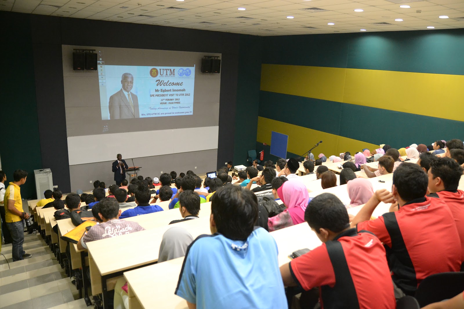 SPE International President 2013 Mr. Egbert Imomoh recently paid a visit to our campus as part of his Distinguished Lecture Series 2012. Prior to his visit to UTM, Mr Imomoh was fresh from a visit to Universiti Teknologi Petronas and Universiti College Sedaya International, also part of his DLS tour. UTM was initially not listed as one of his planned destinations, but given an outstanding presentation by repesentatives of SPE-UTM especially president Faidhi Fahmi at UTP during their Student-Chapter Interaction Session, the generous Mr Egbert after being thoroughly impressed, insisted that he ‘simply had to visit UTM’ before his next destination, Australia.